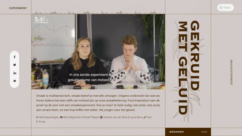 Smaak is multisensorisch, smaak beleef je met alle zintuigen. Volgens onderzoek kan wat we horen tijdens het eten zelfs van invloed zijn op onze smaakbeleving. Food Inspiration nam de proef op de som met een smaakexperiment. Doe je mee? Je hebt nodig: iets zoets, iets zouts, een umami-bom, en een kop koffie met suiker. Wij zorgen voor het geluid.